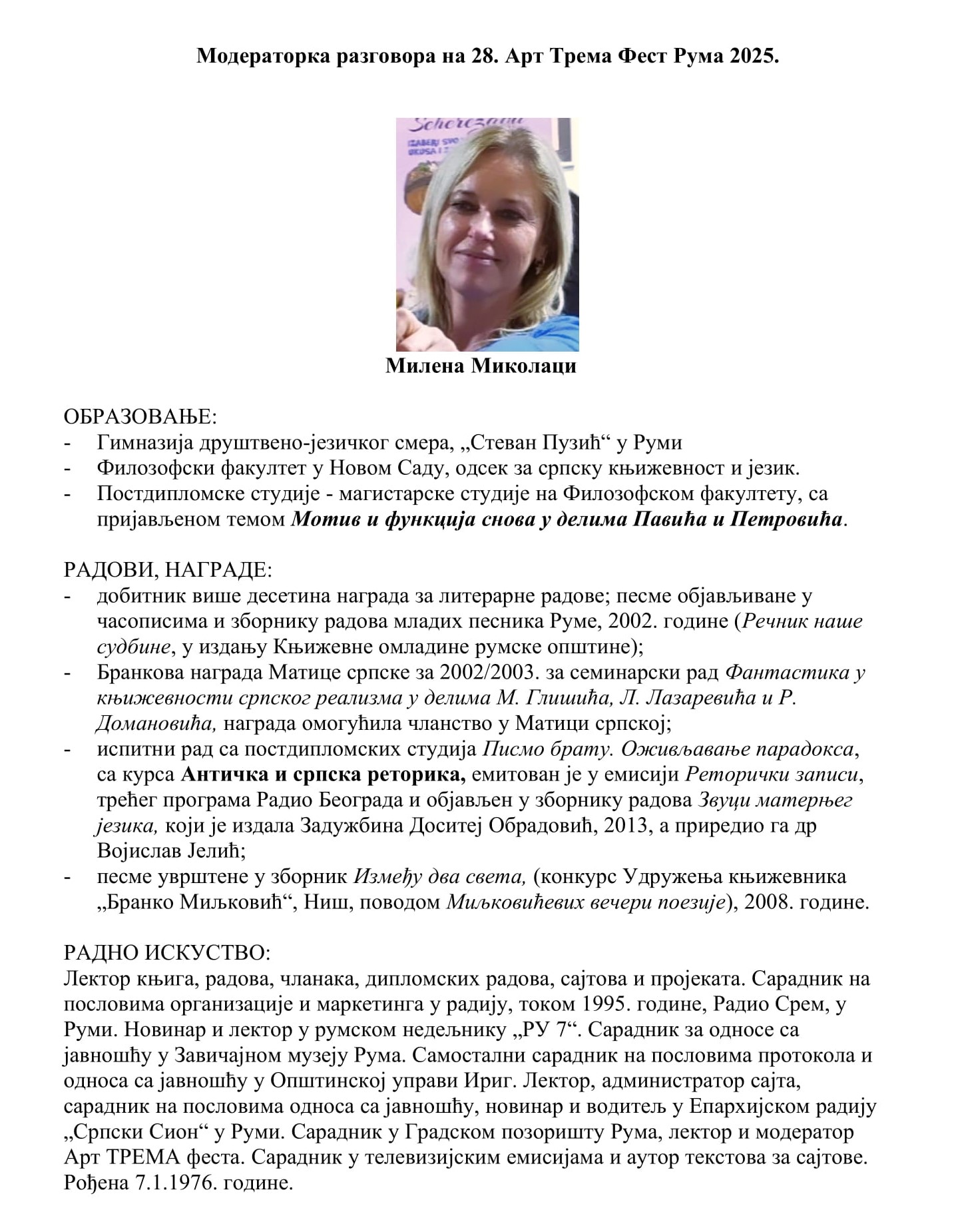 Moderatorka festivala: Milena Mikolaci