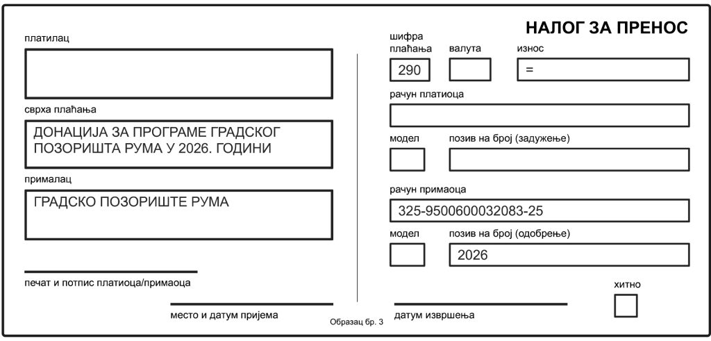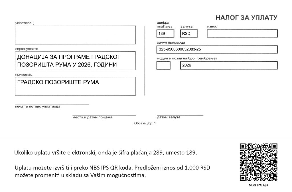 Svrha uplate: Donacija za programe Gradskog pozorišta “Ruma” u 2025. godini